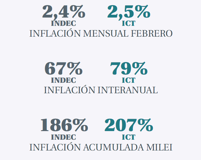 Según el último informe del Mirador de la Actualidad del Trabajo y la Economía (Mate), la inflación interanual en febrero de 2025, frente a 2024, fue de 67% en el Indec pero del 79% en la denominada ICT (Inflación de la canasta de las y los trabajadores).