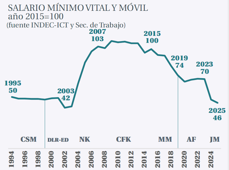 La línea del salario mínimo, que además de un piso de referencia sirve para calcular programas sociales, es un tobogán en el gráfico elaborado por Mate. Creció durante el primer gobierno de Néstor Kirchner, se mantuvo con oscilaciones durante los dos mandatos de Cristina Fernández y desde 2015 no para de caer. En la actualidad está debajo de la mitad del 100 de referencia, similar a la década del 90 menemista.
