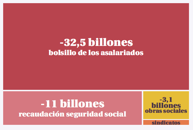 La transferencia desde las familias al Estado (o a los ganadores del modelo) es varias veces billonaria en pesos: 32,5 billones perdió el bolsillo de los asalariados, 11 billones dejó de percibir el Estado por aportes y contribuciones, las obras sociales perdieron 3,1 billones y los sindicatos, 690.000 millones.