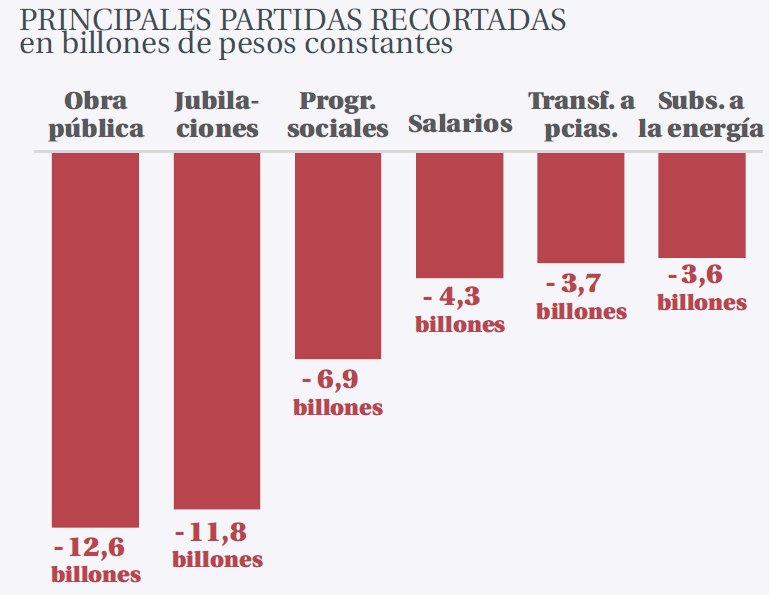 El segundo ítem tiene relación directa con un principio de la administración de la LLA: el freno de la obra pública. Ese concepto encabeza el "ahorró” un total de 50 billones de pesos, incluso por encima del recorte a los pasivos.