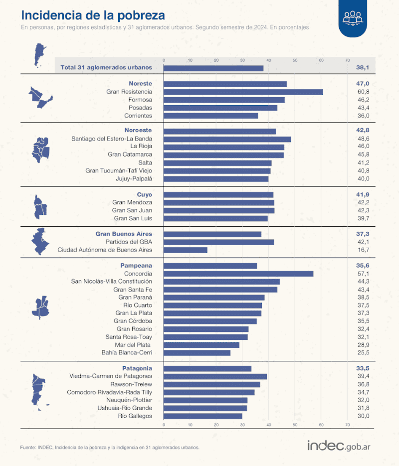 El Instituto Nacional de Estadística y Censos (Indec) informó este lunes que la pobreza alcanzó al 38,1% de las personas y al 28,6% de los hogares en el segundo semestre de 2024. Ese dato, que implica una mejora con el mismo período del año anterior, está hecho de realidades muy distintas en el país según la región.