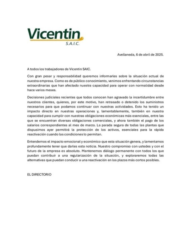 Y vamos a ponernos serios porque el tema es delicado ya que la empresa anunció el viernes que “ante la imposibilidad de obtener contratos de fazón, procede al cierre seguro de todas las plantas en operación (Ricardone y Avellaneda), en la convicción de que para la conservación de la empresa en este momento se impone la protección de los activos, lo que permitirá un rápido arranque cuando esto sea factible”.