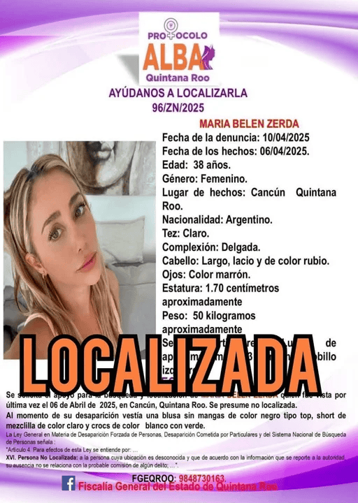 De acuerdo a lo que precisaron las autoridades locales, encontraron a María Belén Zerda sana y salva mientras caminaba por la avenida Luis Donaldo Colosio, una de las principales arterias del municipio de Benito Juárez, en el estado de Quintana Roo, México.