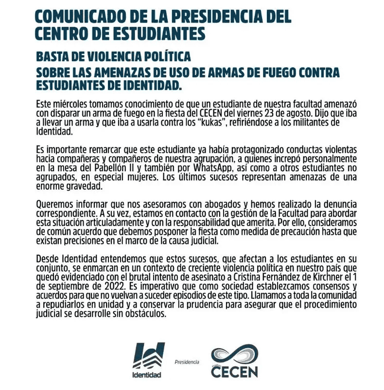 Titulado "basta de violencia política", el centro de Estudiantes publicó un comunicado en sus redes sociales donde detallaron que el estudiante "dijo que iba a llevar un arma y que iba a usarla contra los "kukas", refiriéndose a los militantes de identidad".
