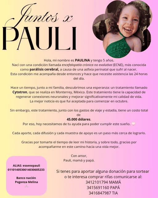 �� Pauli vive en barrio Sarmiento y tiene parálisis cerebral. Su familia impulsa una campaña solidaria para costear un tratamiento en Monterrey, México, que podría mejorar su calidad de vida.
