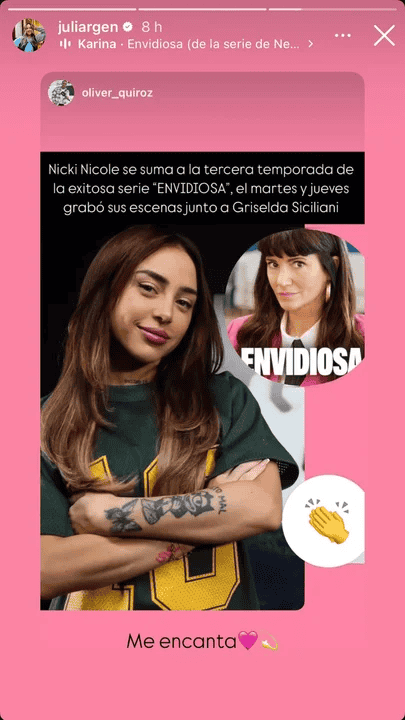 "Nicki Nicole se suma a la tercera temporada de la exitosa serie Envidiosa, el martes y jueves grabó sus escenas junto a Griselda Siciliani", informó a través de sus redes sociales el periodista Oliver Quiroz.