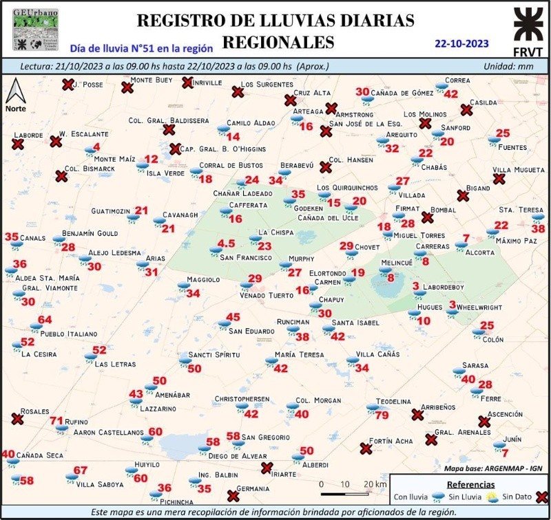 Por ejemplo, a las 9 AM habían caído en 35 milímetros en Carcarañá; 50, en Bombal; 22, en Chabas; 26 en San Lorenzo; 29, en Venado, 42; en General Lagos 65, en Santo Tomé; Villa Cañas 34 y María Teresa; 43 milímetros, entre otros puntos de la provincia.