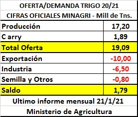 1) “Las cifras de producción, expectativas de exportación y de consumo interno no evidencian un problema de existencias por lo que no deben aparecer problemas para lograr las previsiones de abastecimiento interno para el 2021 en cuanto a volumen. En ese contexto, la Federación Argentina de la Industria Molinera (Faim) dejó expresada que el sector tiene problemas de escasez de oferta, frente a la baja disposición de los productores de vender trigo.