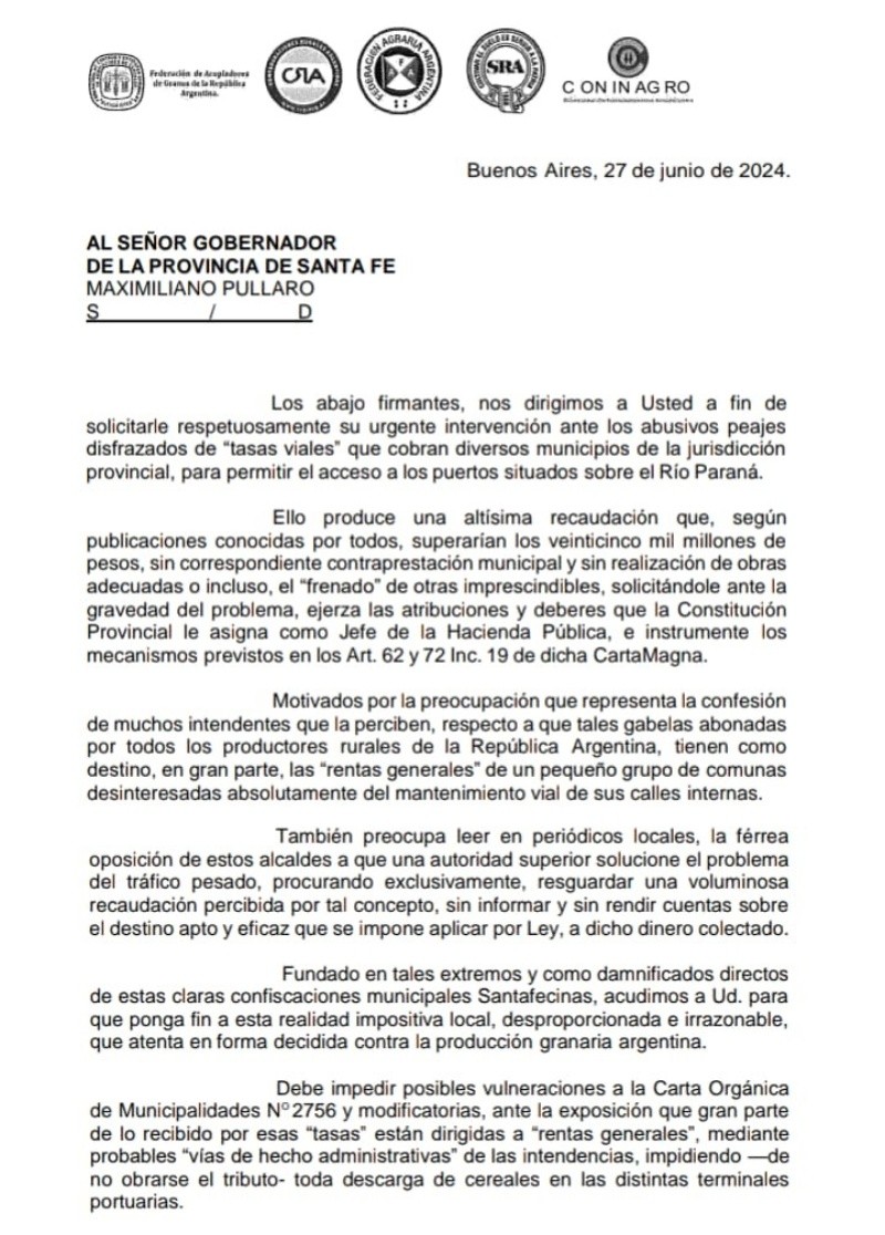 Con la firma también de la Federación de Acopiadores, la Sociedad Rural Argentina, la Federación Agraria Argentina, Confederaciones Rurales Argentinas y Coninagro le enviarán este viernes una carta al gobernador Maximiliano Pullaro para solicitarle “su urgente intervención ante los abusivos peajes disfrazados de tasas viales que cobran diversos municipios de la jurisdicción provincial, para permitir el acceso a los puertos situados sobre el Río Paraná”.