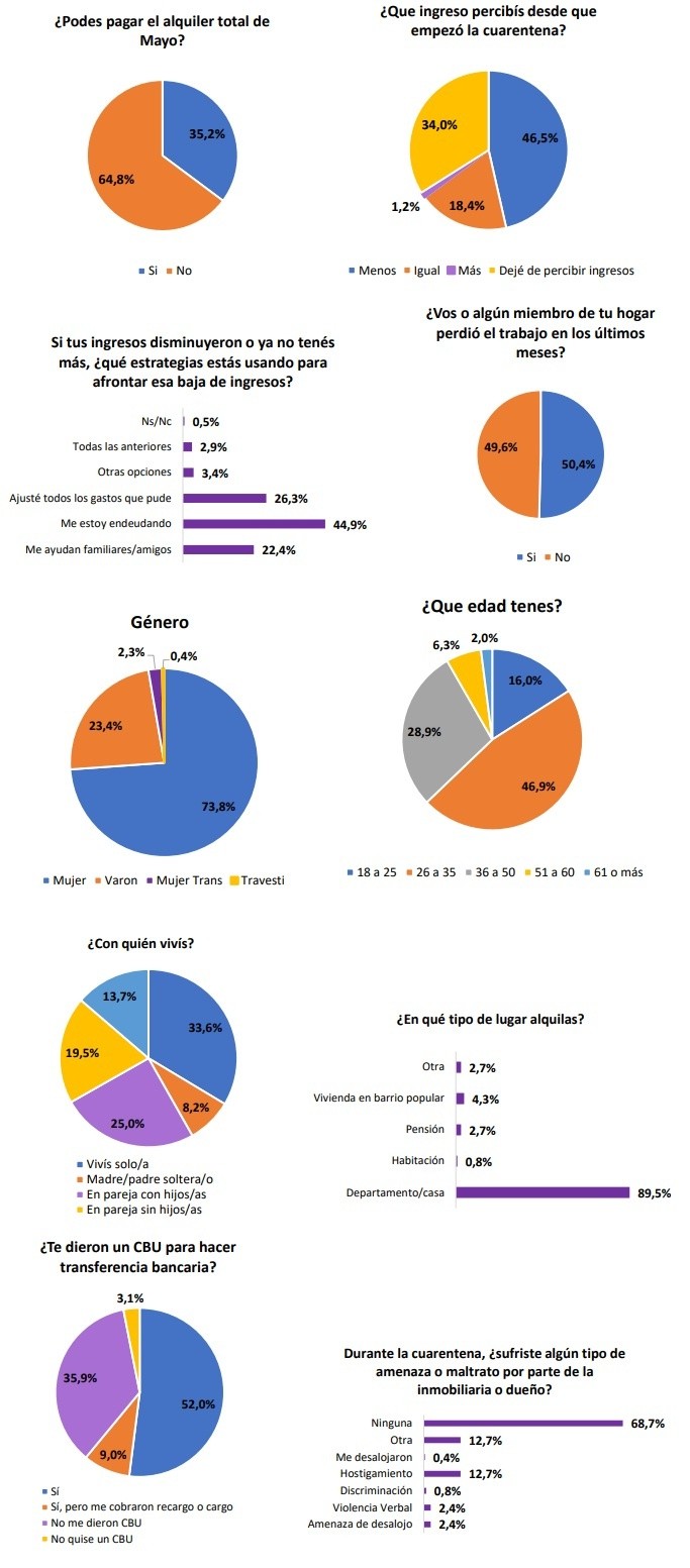 En cuanto a los datos globales nacionales de la encuesta, el 59% de los inquilinos del país no pudo pagar el total del alquiler de mayo. El 46,6% dijo tener menos ingresos en cuarentena y el 27,9% dejó de percibirlos.