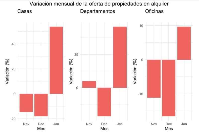 Del informe se desprende que la eliminación de las regulaciones impulsó un fuerte aumento de la oferta de inmuebles para el mercado locativo, que en el caso de los departamentos fue del 53% entre diciembre y enero, pero sin que eso provoque una baja en los valores de los contratos, en gran parte por la combinación del contexto inflacionario y las regulaciones anteriores.