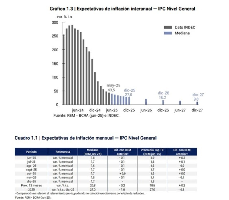 A su vez, los analistas recortaron de manera leve sus expectativas de inflación, al tiempo que elevaron sus previsiones de devaluación y pronosticaron un menor crecimiento del Producto Bruto Interno (PBI) para este año. Según los cálculos de los participantes, la inflación será de 1,8% en junio, 0,1 puntos porcentuales (p.p) por debajo de lo que habían avizorado en el REM previo. Asimismo, para los meses siguientes también se redujeron en 0,1 p.p las estimaciones, con los cual para todo 2025 el mercado espera un incremento del 27% en el Índice de Precios al Consumidor (IPC), cuando en mayo se esperaba un 28,6%. Paralelamente, se proyectó un crecimiento del 5% en el PBI, 0,2 p.p por debajo de la estimación de mayo. También se destacó un ajuste al alza en la desocupación esperada (desde 6,8% a 7,4%) y un menor superávit comercial (desde USD 7.761 millones a USD 6.133 millones), fundamentalmente por un recorte en las exportaciones esperadas.