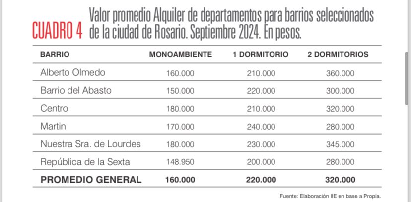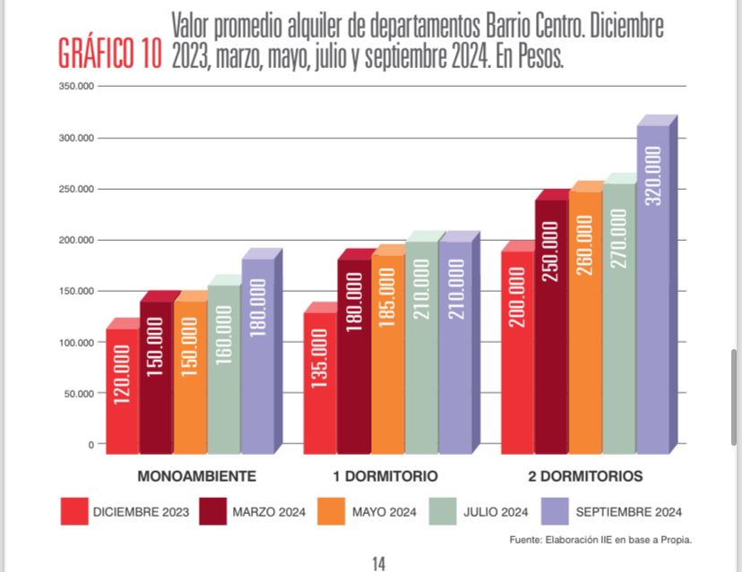 ofertados: subieron en dólares un 9,2% entre diciembre de 2023 y septiembre de 2024. Los departamentos de un dormitorio se incrementaron un 12,9% entre diciembre de 2023 y septiembre 2024, mientras que los de dos dormitorios lo hicieron en un 14,4% en igual período", concluyó el informe del Colegio de Corredores Inmobiliarios de Rosario.