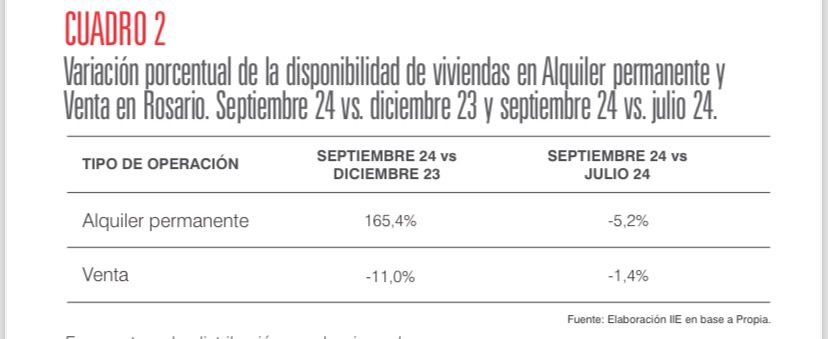 Otro dato a destacar sobre el mercado de alquileres es que el aumento de la disponibilidad de viviendas ofrecidas en alquiler en Rosario desde diciembre de 2023 a septiembre de 2024 fue de 165,4% y la razón fue la eliminación de la normativa que regulaba los alquileres. No obstante, esa disponibilidad cayó entre septiembre y julio de 2024 un 5,2%.