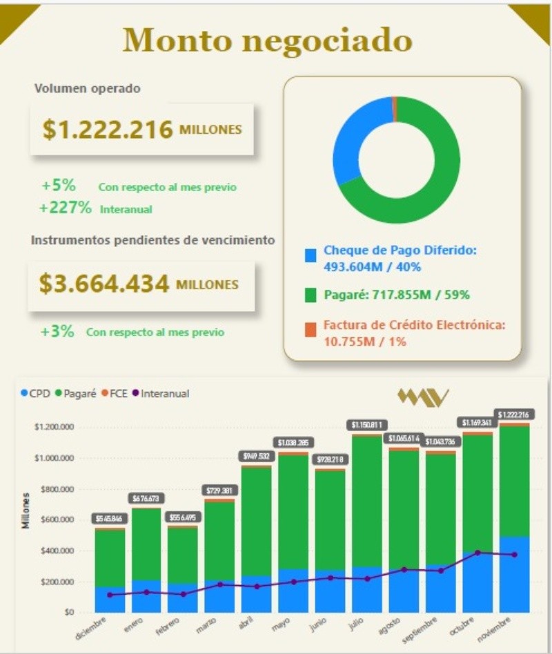 Otro tema que merece una mirada más profunda es el Pagaré Bursátil. Por su facilidad operatoria, se convirtió en los últimos años en el principal instrumento de financiamiento que se transa hoy en el Mercado Argentino de Valores (MAV) quitándole el trono que por años tuvo el cheque de pago diferido. Solo en noviembre pasado se negociaron $717 M en Pagarés, representando el 59% del volumen operado en el MAV en ese mes.