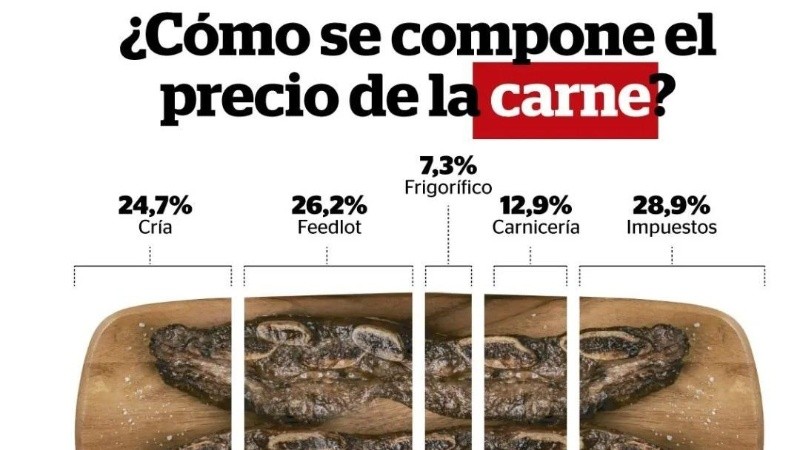Finalmente, sobre el impacto de las exportaciones en total producido sólo representa el 15% por lo que su aumento no impacta en la disponibilidad de carne para el mercado interno. Además, el grueso de los cortes que se despachan al exterior no son los que se consumen en el mercado interno. Según la fundación Fada, que reúne a especialistas en mercados agropecuarios, los impuestos son el principal costo en el precio de la carne, representando el 28% del valor final.