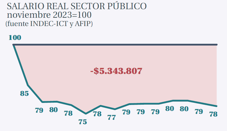 En el caso de los estatales, la motosierra agravó todo. El ingreso nunca se recuperó del ajuste fiscal. "Actualmente es 22% inferior al del fin del mandato de Alberto Fernández y, desde que gobierna Milei, cada estatal acumula una pérdida de más de 5 millones de pesos", calcularon.