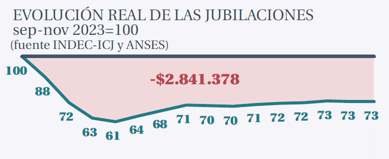 Esa involución del poder de compra se traduce en una pérdida del 27% del poder de compra desde que gobierna La Libertad Avanza: unos 3 millones de pesos acumulados (mes por mes) por cada jubilado desde entonces.