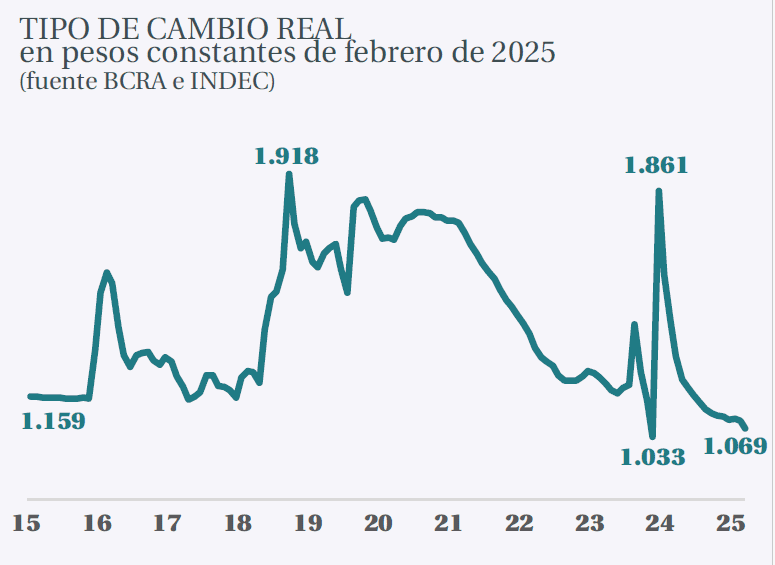 El tipo de cambio real del dólar está en umbrales mínimos en la última década. Después del salto de diciembre de 2023, la moneda estadounidense "se sigue abaratando en la economía local". Algo que podría cambiar en breve por los condicionamientos que pondría el FMI al paquete de auxilio de 20 mil millones de dólares que pidió el ministro Luis Caputo.