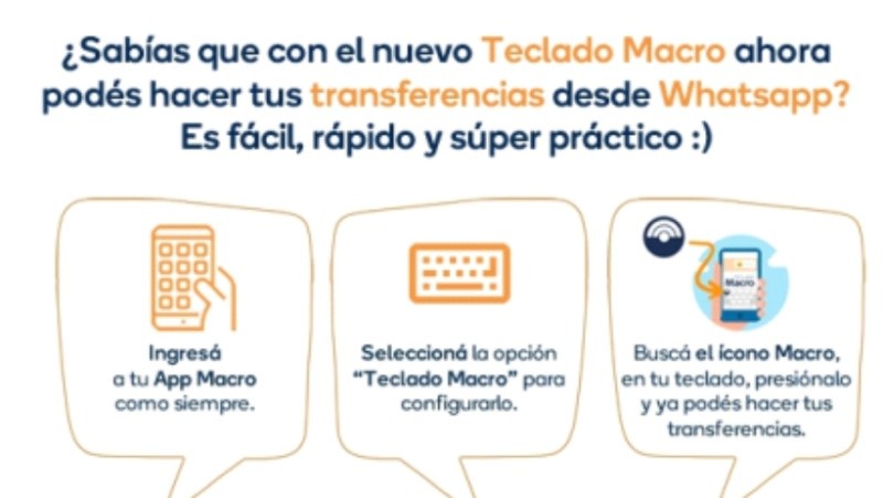 “Utilizamos el teclado de los teléfonos inteligentes como un nuevo canal de servicio, información y comunicación para nuestros clientes. Esta es una solución segura y fácil pensada específicamente desde la demanda, en lo que el consumidor necesita hoy en día. Sin la necesidad de dejar la red social de mensajería instantánea, el usuario puede realizar una transferencia inmediata y operar con el banco de manera cómoda y sencilla”, aseguró Milagro Medrano, Gerente de Relaciones Institucionales y Atención al Cliente de Banco Macro.Para acceder a las “chatferencias” el cliente sólo tiene que configurar el teclado en su teléfono, ingresando desde la aplicación a la opción “Teclado Macro” del menú.
