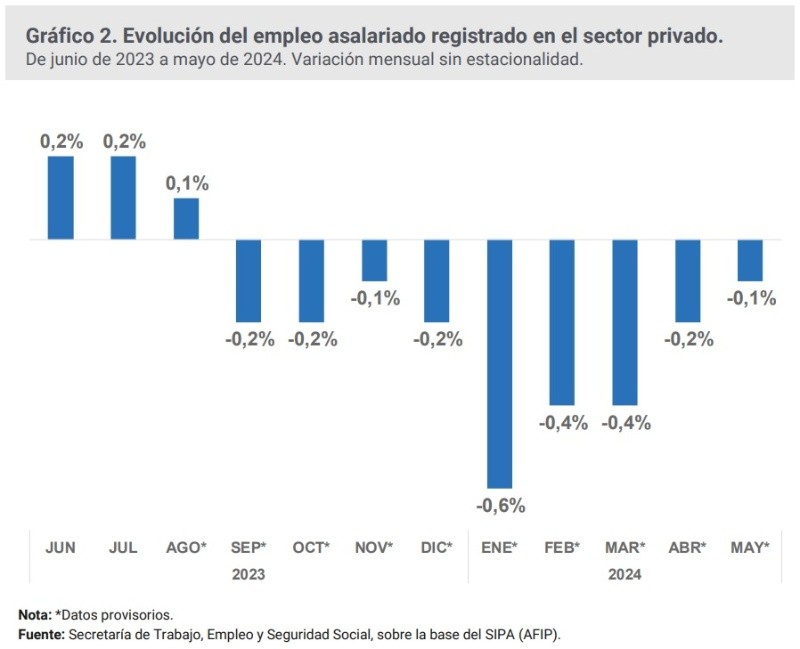 De acuerdo a las cifras del Sipa, el nivel de empleo privado registrado en empresas durante mayo de 2024 presentó una contracción del 0,1% en relación con abril y acumula desde diciembre de 2023 una reducción de 2,1%.