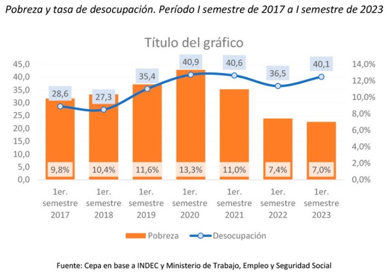 Según los datos oficiales, la incidencia de la pobreza en 31 aglomerados urbanos en el primer semestre de 2023 se aceleró al 40,1%. Esto implicó un incremento de 3,6 puntos porcentuales (p.p.), desde el 36,5% que marcó el índice en el mismo período de 2022.