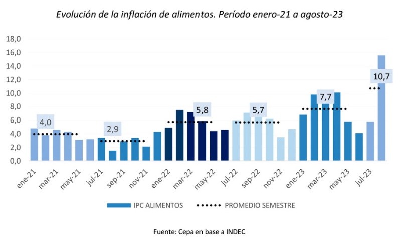 La inflación de alimentos en el primer semestre de 2023 (7,7%) superó la del primer semestre de 2022 (5,8%) en casi 2 puntos porcentuales, y este aumento afectó los niveles de la canasta alimentaria, lo cual también impactó en la tasa de incidencia de la indigencia y la pobreza. La Canasta Básica Total (CBT) se incrementó en un 5,6% en términos reales durante el primer semestre de 2023 en comparación con el semestre equivalente anterior. Este incremento de la CBT, que incluye alimentos y otros bienes y servicios básicos, también contribuye al aumento de la pobreza e indigencia. Los ingresos de los trabajadores, especialmente los no registrados, se redujeron durante el primer semestre de 2023 en comparación con el año anterior. Por lo tanto, hubo una retracción real del salario mínimo vital y móvil, lo que afecta a la población con menores ingresos. Al mismo tiempo se registró una reducción en el valor real de la Asignación Universal por Hijo (AUH) y una mejora en la jubilación mínima, aunque esta última muestra una retracción respecto al semestre inmediato anterior. Estos factores influyen en los ingresos de las familias y su capacidad para cubrir la canasta básica. Por otro lado, el documento también señala que la mediana salarial en el sector privado se encuentra por debajo de la línea de pobreza, lo que significa que la mitad de los trabajadores registrados privados no tienen ingresos suficientes para cubrir sus necesidades básicas.