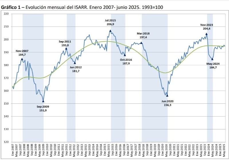 “Durante este último año y medio, la actividad económica regional tuvo una magra performance. En el período comprendido entre diciembre de 2023 y mayo de 2024, el ISARR muestra una retracción de 9,6%. Pasado el período recesivo, la economía regional se mantuvo estancada”, detalla.