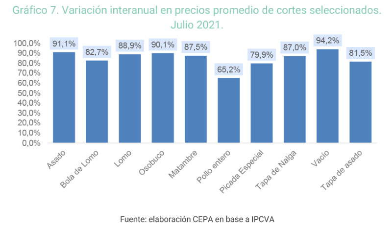 En términos interanuales, es decir respecto a julio 2020, la variación de precios nominales de la carne (+85,3%) se movió muy por encima de la variación de precios del período (+50,2% aproximadamente), lo cual implica un encarecimiento de los diversos cortes en términos reales.