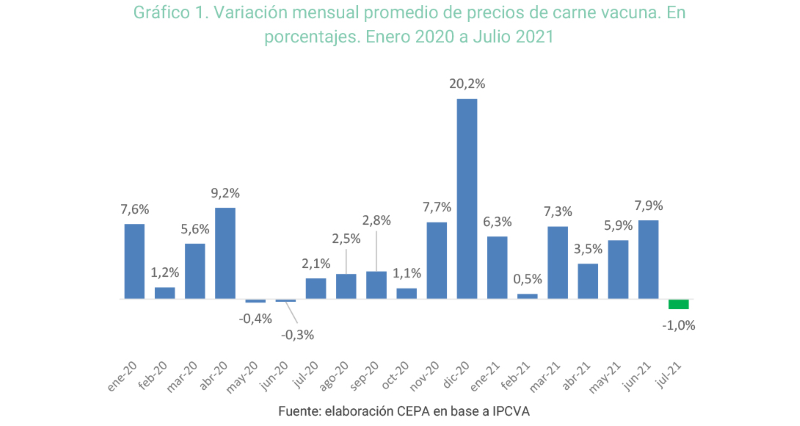 En lo que de este año, enero, marzo y junio tuvieron subas de 6,3% 7,3% y 7,9%, respectivamente. Pero en julio, posterior a las restricciones a la exportación de algunos cortes y el reordenamiento del mercado, se cortó la fuerte dinámica alcista: hubo en promedio una caída de 1,0%.