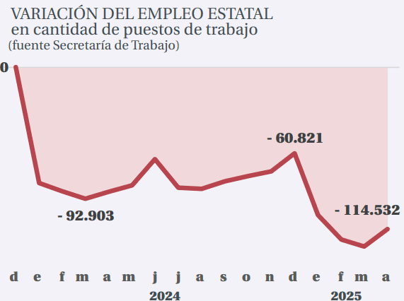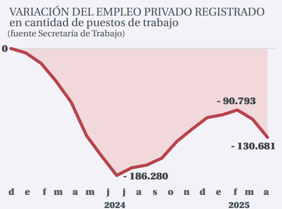 El relevamiento de los economistas locales para julio de 2025 contabilizó una caída de 130.681 trabajadores privados, 114.532 del sector público y 24.912 de casas particulares, entre abril de 2025 y noviembre de 2023.