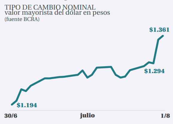 El estudio de Mate analiza el salto del dólar que llegó a cotizar 1.380 pesos a fines de julio en el Banco Nación y señala: "Durante julio se generó un aumento del precio del dólar de 14%. Gran parte de esta devaluación del peso se concentró en la última semana del mes. La inestabilidad cambiaria es inevitable para este modelo económico".