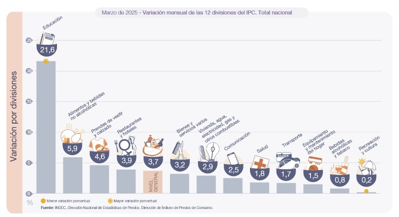 La inflación de marzo fue de 3,7%, marcando así una aceleración con respecto al dato de febrero (2,4%) que se explica fundamentalmente a raíz de los mayores incrementos en educación por el inicio del ciclo lectivo y alimentos y bebidas no alcohólicas, según el informe publicado este viernes por el Instituto Nacional de Estadística y Censos (Indec). Se trata de la inflación más alta desde agosto del año pasado, cuando los precios se incrementaron un 4,2%.