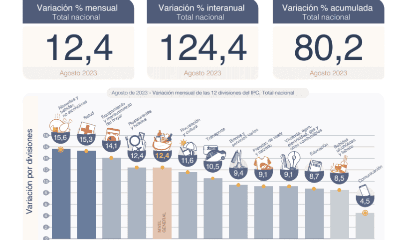 Los precios al consumidor (#IPC) aumentaron 12,4% en agosto de 2023 respecto de julio y 124,4% interanual. Acumularon un alza de 80,2% en los primeros ocho meses del año https://t.co/58Wlvj4OFZ pic.twitter.com/LRihbYlx3j