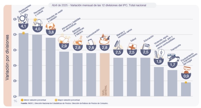Por su parte, las dos divisiones que registraron las menores variaciones en abril de 2025 fueron Transporte (1,7%) y Equipamiento y mantenimiento del hogar (0,9%).