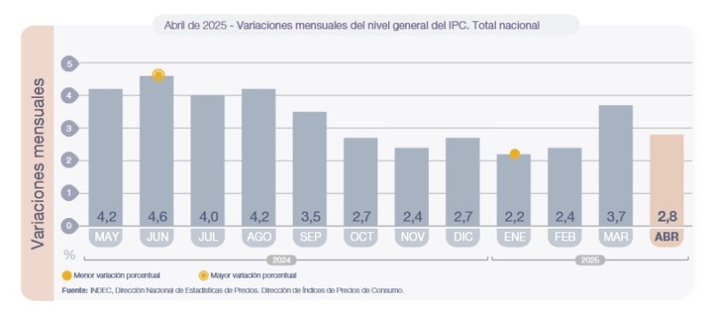 El Instituto Nacional de Estadística y Censos (Indec) informó que la inflación de abril fue de 2,8%, lo que marcó una desaceleración con respecto al índice de precios de marzo (3,7%). De esta manera, el incremento promedio acumulado de los precios en lo que va del año se situó en 11,6%, mientras que a nivel interanual la suba fue de 47,3%.