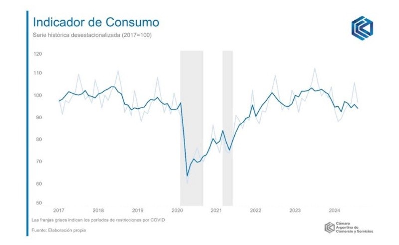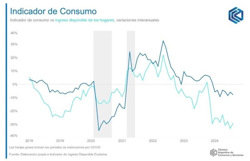Durante los primeros ocho meses del 2024, el IC acumuló una baja del 6,4% con respecto al mismo período de 2023. En tanto, la contracción de agosto coindició con la leve aceleración de la inflación registrada en el mismo mes (4,2%), que según la CAC "afectó negativamente al consumo".