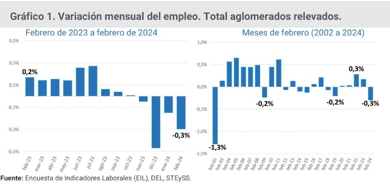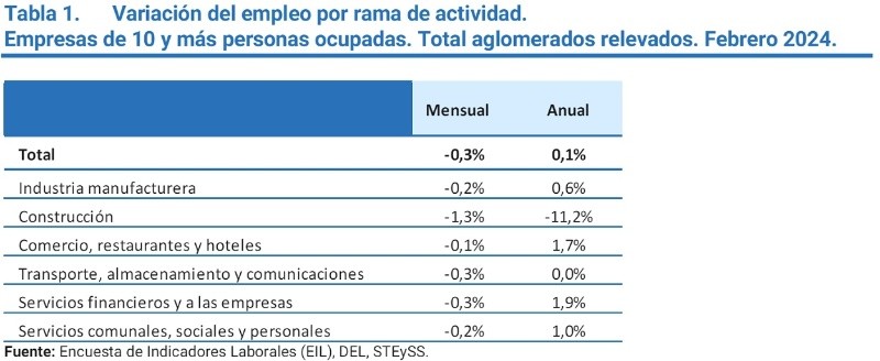 Así, la contracción alcanzó un 0,9% entre noviembre de 2023 y febrero de 2024. En términos interanuales, el nivel de empleo asalariado registrado mantuvo un incremento de 0,1%, prácticamente estancado.