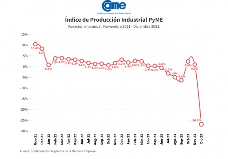 El nivel de actividad de las pequeñas y medianas industrias registró en diciembre una caída interanual de 26,9%, con la que cerró el 2023 con una baja acumualada de 2,6% a lo largo del año pasado, según un informe elaborado por la Confederación Argentina de la Mediana Empresa (Came).