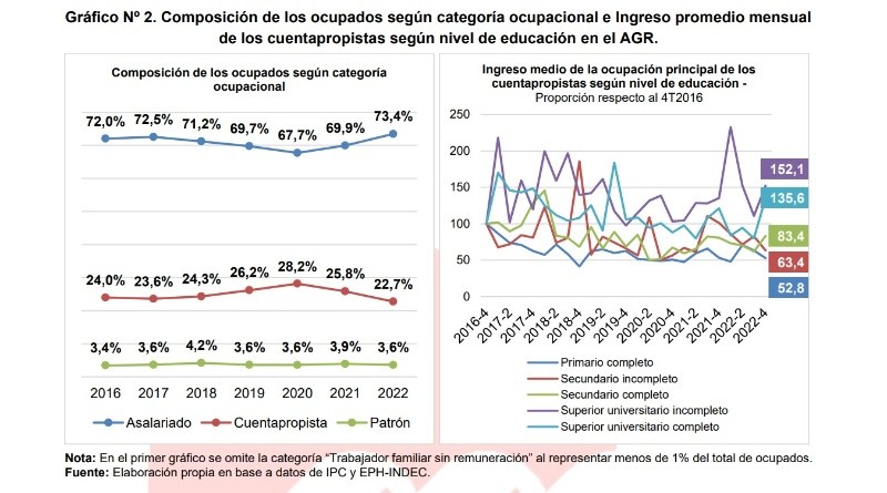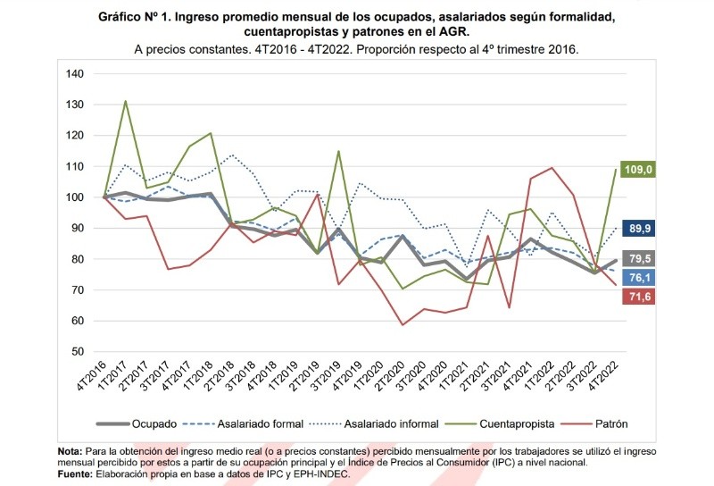 No obstante, más allá del dato de que "el empleo viene creciendo lentamente", la discusión también incluye otros puntos que, por el contrario, no son positivos. Uno de ellos es el del nivel de ingresos. "El incremento del empleo no va de la mano de un incremento del salario, sino muy por el contrario. Dado que hay un aumento de la oferta de empleo pero la demanda no crece demasiado, caen los precios" de los salarios, explicó. En esa línea, Navarro precisó: "Entre el cuarto trimestre del 2016 y el cuarto trimestre del 2022, los ingresos mensuales promedio tanto de asalariados como de cuentapropistas cayeron un 20%". La caída de los ingresos se venía manteniendo "sistemáticamente" hasta finales del año pasado, cuando se observó que la curva se estancó, pero con "el nivel de inflación que tenemos, es poco probable que en el primer trimestre de este año los salarios se recuperen", indicó una de las responsables del informe. A su vez, luego del profundo impacto que tuvo la época más dura de la pandemia de coronavirus, que afectó más que nada al sector informal, se produjo a lo largo de 2021 una recuperación de los trabajos en dicho sector, mientras la cantidad de empleo formal se mantuvo sin crecer, tanto en el ámbito público como privado. Este fenómeno, señaló Navarro, explica la baja tasa de desempleo registrada hasta finales del año pasado. En cuanto a la composición del empleo asalariado, el informe destaca lo siguiente: "Si bien fue la categoría que más personas sumó (+50.158) en los últimos seis años, su expansión se explicó principalmente por el crecimiento del empleo privado informal y, en menor medida, por el del empleo público formal". Por otro lado, la economista comentó que se produjo un cambio en la composición de la categoría de cuentapropistas, que generalmente estaba asociada con "trabajos menores como changas o tareas sin continuidad". "Tanto en el aglomerado del Gran Rosario como a nivel nacional, lo que se está viendo es que está creciendo la participación en el cuentapropismo de los más educados", detalló. Sobre este punto, detalló que entre quienes trabajan como cuentapropistas el 38% son universitarios con títulos o que aún no se recibieron, porcentaje que antes era del 35%. Aquellos con secundario completo o incompleto, en tanto, representan el 44% de los cuentapropistas, cuando antes representaban un 42%. "Ese corrimiento, el de quienes eligen trabajar por cuenta propia, lideró la recuperación de los salarios en el último trimestre del año pasado", indicó, y precisó que quienes tienen una educación universitaria incompleta cobran un salario que aumentó un 52% con respecto al 2016. Por otro lado, la franja de la población laboralmente activa que tiene el secundario incompleto perdió un 36,6% del poder de compra de sus salarios, mientras que quienes no terminaron la primaria vieron depreciarse sus ingresos un 52% desde el cuarto trimestre de 2016. "En resumen, aunque el mercado laboral del Gran Rosario muestra un buen desempeño en términos de ocupación y desempleo, la calidad del empleo creado y la evolución del ingreso real de los trabajadores en general no resultan alentadores. Una gran parte de los nuevos ocupados son trabajadores asalariados informales con ingresos bajos, quienes experimentan una disminución en su poder adquisitivo desde finales de 2016 debido al aumento de la inflación", concluye el documento.