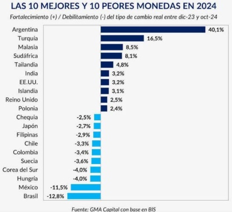 Según expone el análisis, el peso argentino superó ampliamente a la segunda moneda en la lista, la lira turca, que se revalorizó un 16,5% en el período diciembre-octubre. El ringgit de Malasia, en tanto, se apreció un 8,5%.