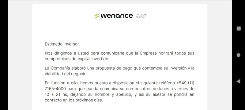 El lunes, Wenance ya había anunciado una primera propuesta de pago para sus cercas de 3.000 clientes registrados, que –según la propia financiera- tenía casi el 70% de adopción de sus ahorristas, básicamente sus grandes inversores.