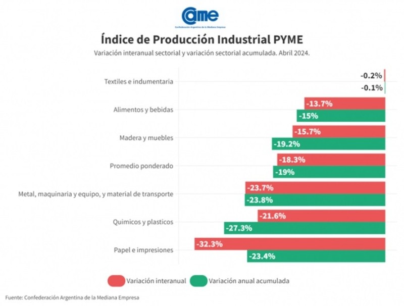 Came relevó que los seis sectores manufactureros del segmento pyme tuvieron caídas en la comparación anual en abril, siendo los más afectados "Papel e Impresiones" (-32,3%) y "Metal, maquinaria, equipos y material de transporte" (-23,7%).