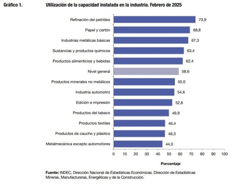 La utilización de la capacidad instalada en la industria se ubicó en 58,6% en febrero, un nivel que estuvo apenas por encima del 57,6% registrado en el mismo mes de 2024. El nivel de producción industrial sigue sin alcanzar el 60%, por lo que se mantiene entre los peores de los últimos años desde la pandemia.