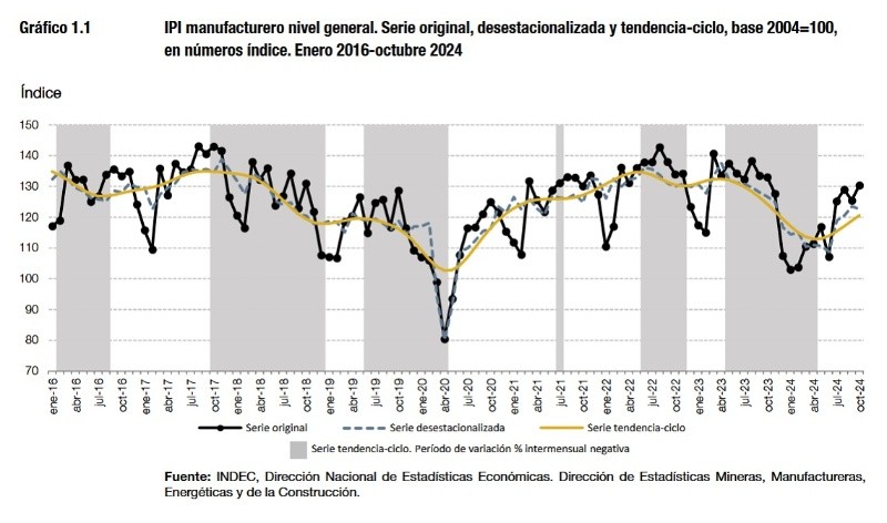 En el caso de la actividad industrial, el sector registró en octubre una baja de 0,8% con respecto al mes anterior en la serie desestacionalizada. Por el contrario, el índice serie tendencia-ciclo mostró una variación positiva de 1,4% en octubre. El Indec informó que 11 de las 16 divisiones de la industria manufacturera presentaron caídas interanuales en el décimo mes del año, ordenados de la siguienre manera en base a su incidencia: Productos minerales no metálicos (-16,8%); Industrias metálicas básicas (-11,4%); Productos de caucho y plástico (-12,0%); Productos de metal (-12,3%); Maquinaria y equipo (-8,0%); Productos textiles (-20,9%); Sustancias y productos químicos (-2,4%); Otros equipos, aparatos e instrumentos (-6,7%); Muebles y colchones, y otras industrias manufactureras (-2,9%); Madera, papel, edición e impresión (-0,3%); y Prendas de vestir, cuero y calzado (-0,3%). Por su parte, mostraron subas las divisiones de Alimentos y bebidas (6,9%); Refinación del petróleo, coque y combustible nuclear (12,4%); Vehículos automotores, carrocerías, remolques y autopartes (4,7%); Otro equipo de transporte (9,2%); y Productos de tabaco (7,0%).