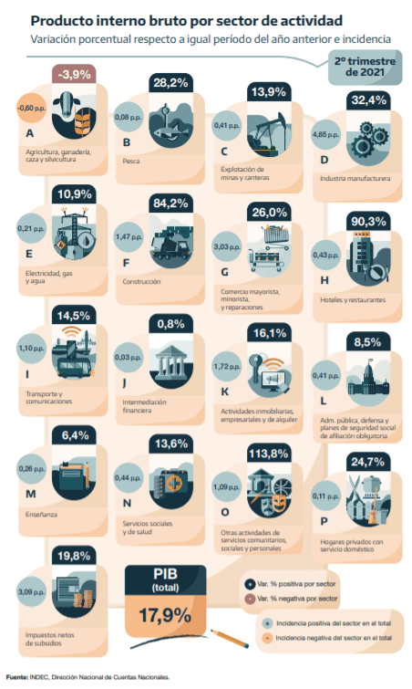 En un contexto de recuperación de la actividad económica, el Producto Interno Bruto (PIB) de la Argentina tuvo un incremento de 17,9% durante el segundo trimestre del año, en comparación con el mismo período del 2020, informó hoy el Instituto Nacional de Estadísticas y Censos (Indec).