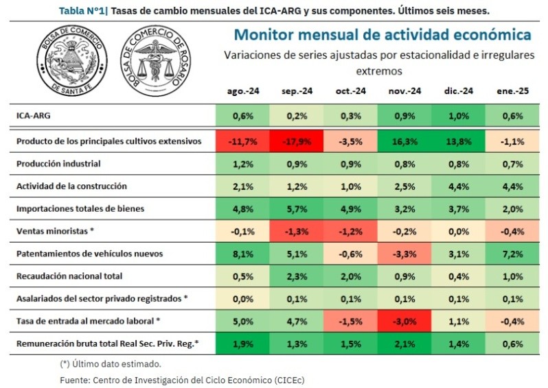 La actividad económica registró en enero un alza del 4,3% a nivel interanual y del 0,6% con relación a diciembre, según datos de un informe elaborado en conjunto por la Bolsa de Comercio de Rosario y la de Santa Fe.