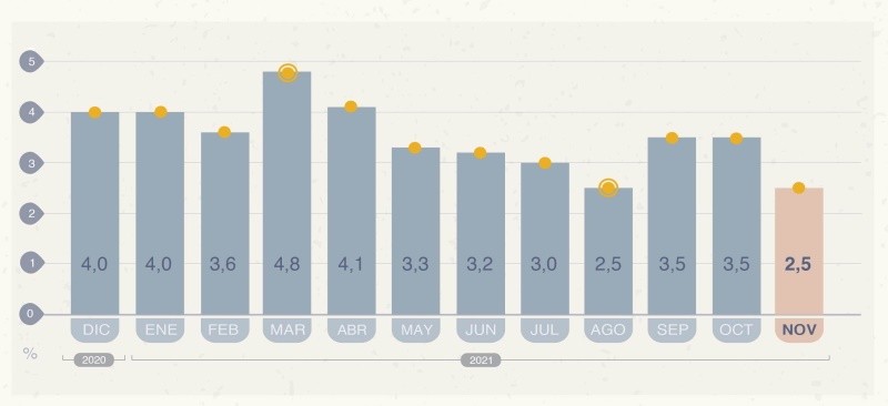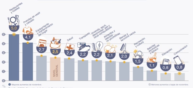 La inflación de noviembre fue de 2,5%, por debajo del 3,5% que había registrado tanto en septiembre como en octubre, informó este martes el Instituto Nacional de Estadística y Censos (Indec)