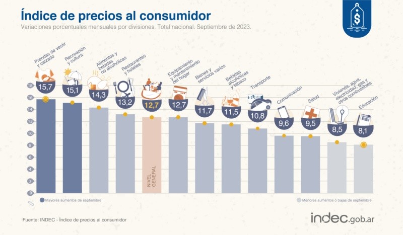 Los precios al consumidor (#IPC) aumentaron 12,7% en septiembre de 2023 respecto de agosto y 138,3% interanual. Acumularon un alza de 103,2% en los primeros nueve meses del año https://t.co/GTVFgmYq1J pic.twitter.com/xof6yqYE3W