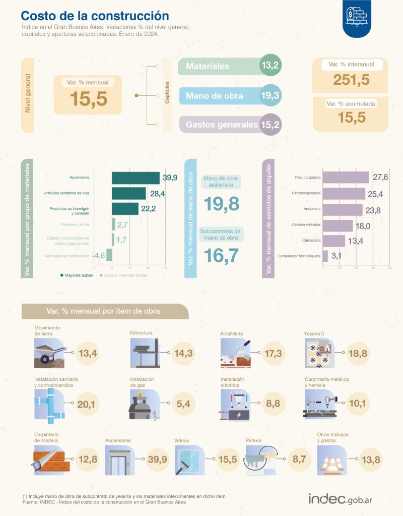 El organismo nacional también informó que el índice del costo de la construcción en el Gran Buenos Aires (ICC) subió 15,5% en el primer mes del año. Este avance fue el resultado de un alza de 13,2% en los "Materiales", de 19,3% en el costo de la "Mano de obra" y de 15,2% en los "Gastos generales". Sin embargo, en la comparación interanual el costo de la construcción trepó 251,5%, mientras que el Índice de Precios al Consumidor (IPC) en ese mismo lapso de tiempo se ubicó en 254,2%.